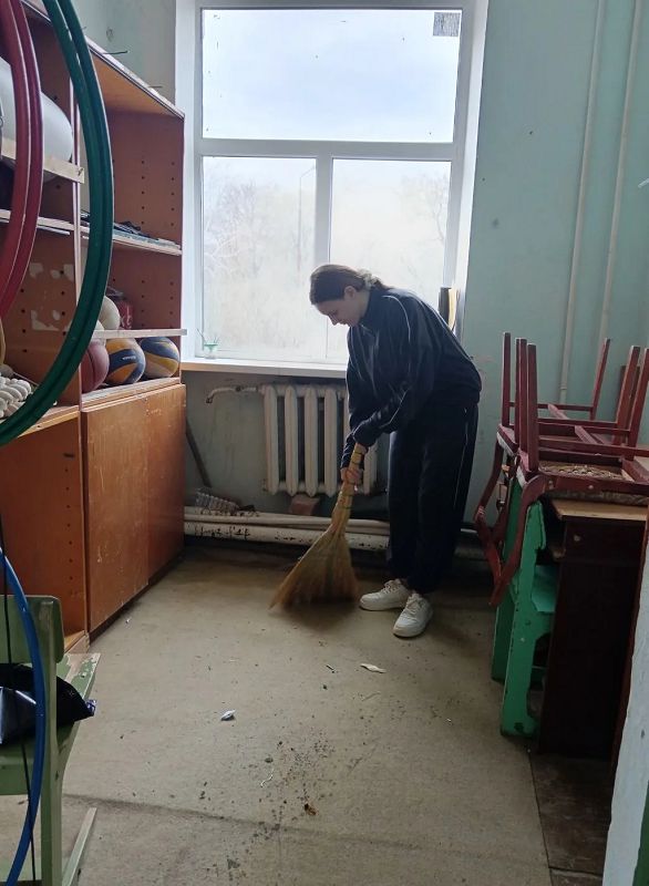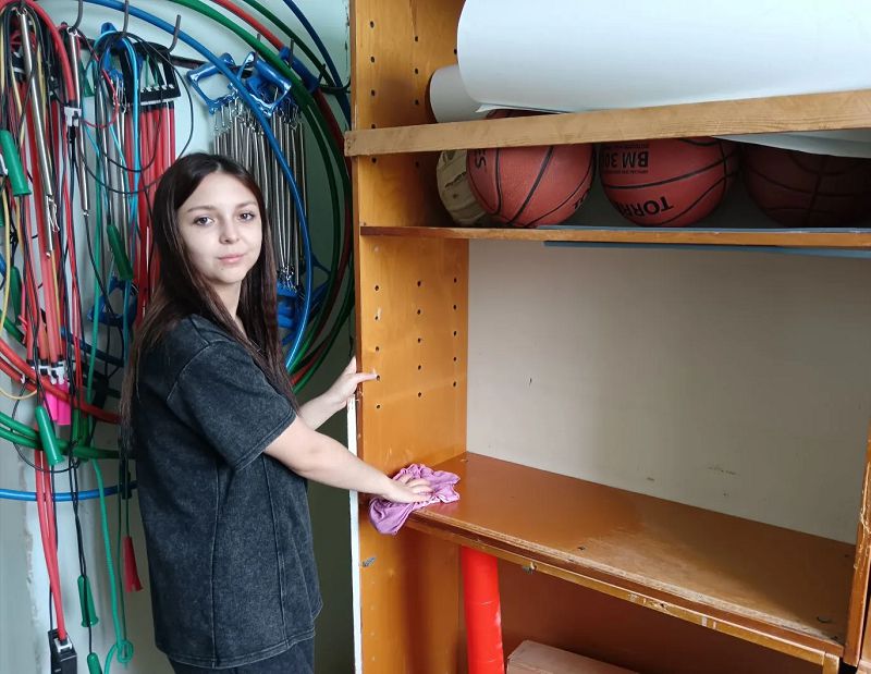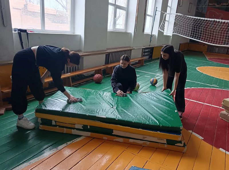 Первый день ребята занимались уборкой школьного спортзала и подсобных помещений.