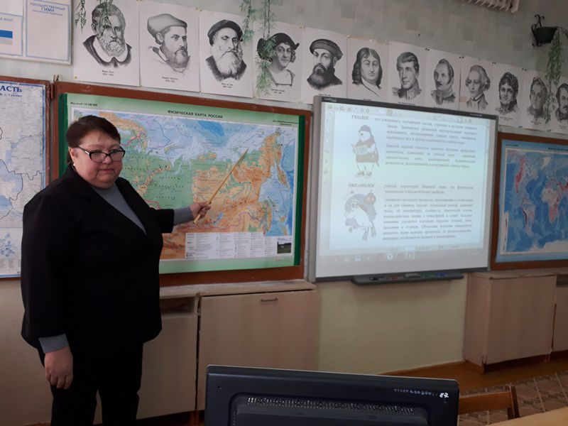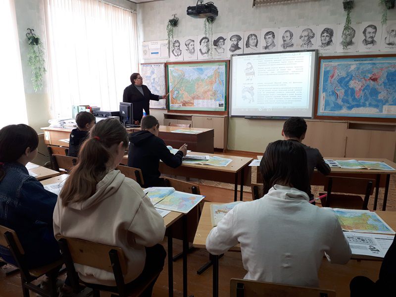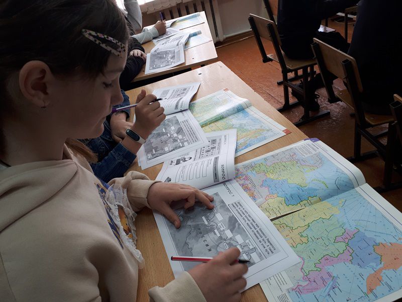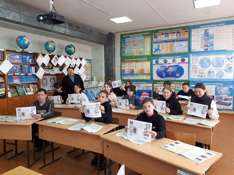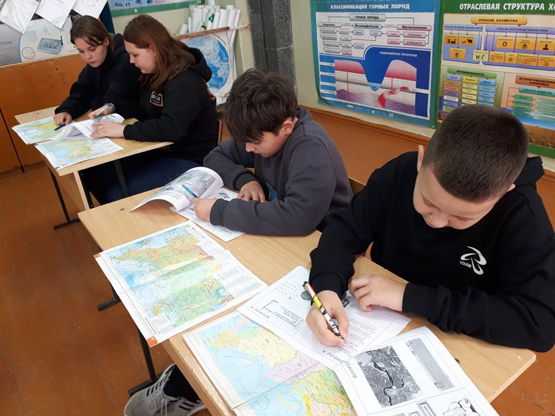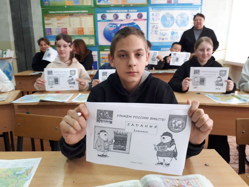 Русское Географическое Общество с 6 по 18 апреля 2026 года рекомендовало всем субъектам РФ поучаствовать в просветительском проекте «День географии в школе». 16 апреля учитель Мороз Е.В. провела познавательное внеклассное мероприятие и географический диктант для обучающихся 5-7 классов. Тема: «Узнаём Россию вместе!» В Кабинете было размещена географическая карта России, на партах у каждого участника было предусмотрено наличие атласов с различными картами территорий Российской Федерации. Задания выполнялись с использованием карт атласа: физическая карта России, карта федеративного устройства России, карта часовых зон на территории России, карта особо охраняемых территорий и заповедников, геологическая карта, карта народов и основных религий России. Елена Викторовна познакомила учащихся с географическими профессиями, которые будут присутствовать в заданиях диктанта: геолог, океанолог, почвовед. Ребята познакомились с презентацией, затем аккуратно заполнили бланки с заданиями.