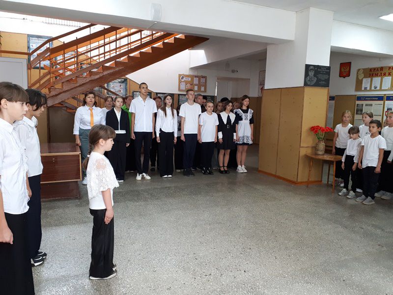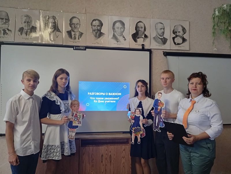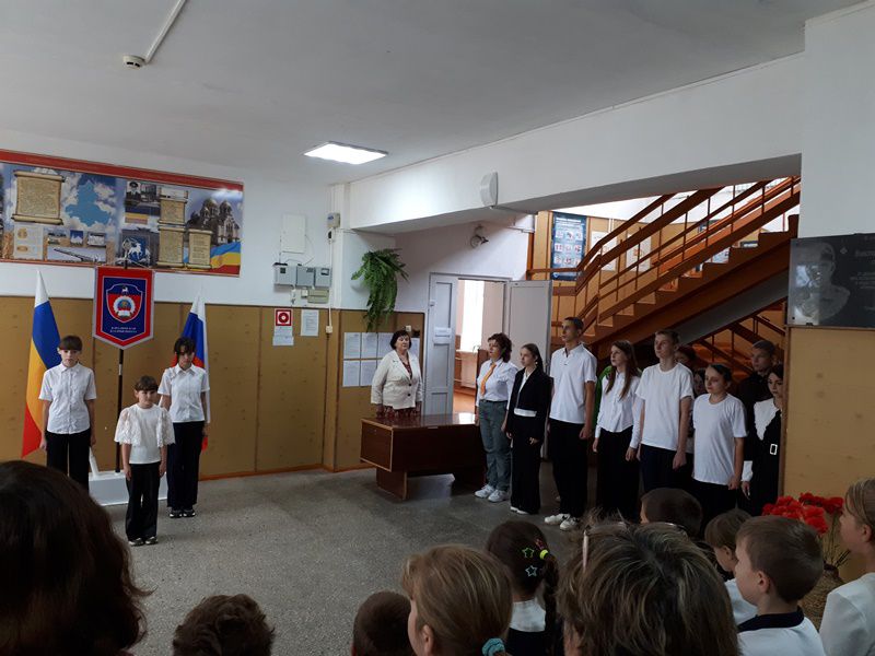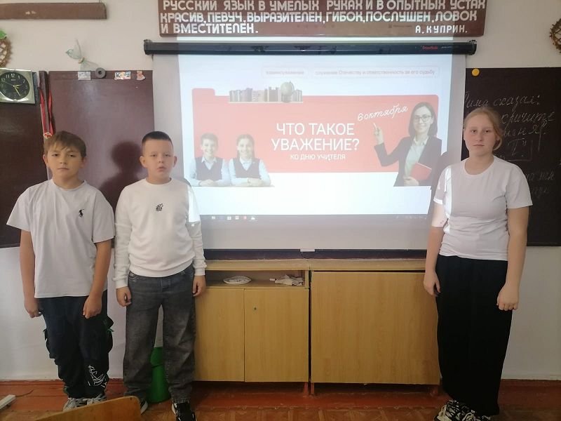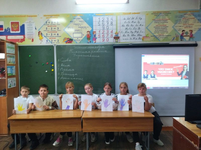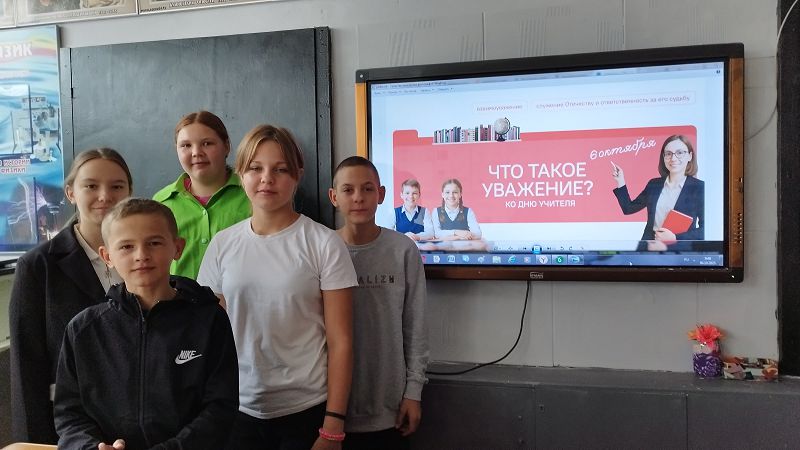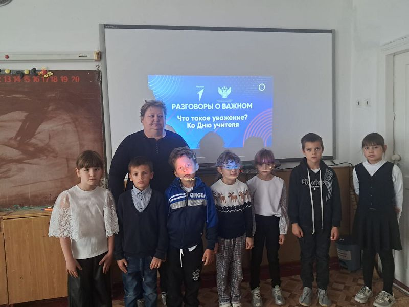 Утро 6 октября 2025 года в школе началось с линейки, на которой был вынесен флаг Российской Федерации и исполнен гимн. После линейки классы разошлись по кабинетам, где их ожидало внеурочное занятие «Разговоры о важном», тема которых была «Что такое уважение? Ко Дню учителя».