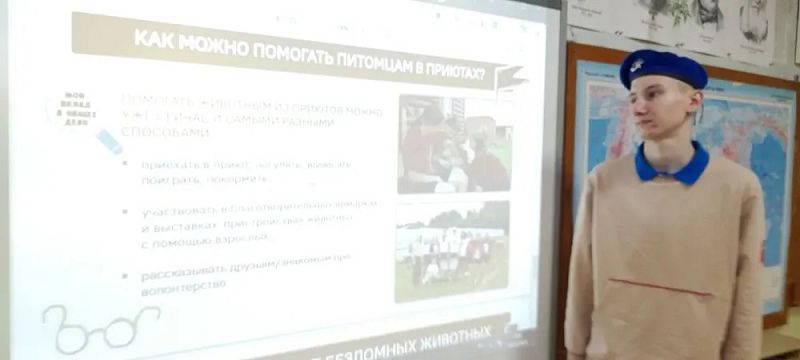 Отдельное внимание уделено подвигам животных во время Великой Отечественной войны. В преддверии Дня волонтера учащиеся посмотрели видеоинтервью с президентом Благотворительного фонда помощи бездомным животным «Ника» Верой Митиной, которая рассказала об ответственном отношении к питомцам.